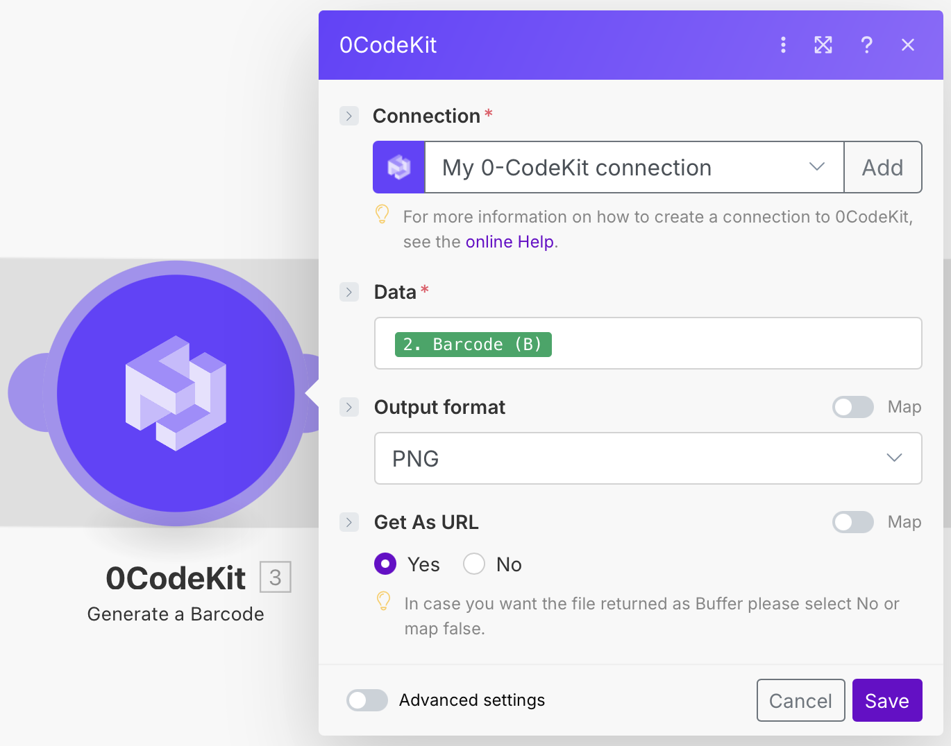 Later, we need to integrate a 0CodeKit module with the event "Generate a Barcode", which will generate a barcode based on the Google Sheet information. To set it up, we need to enter the "Barcode" icon into the Data field, choose PNG as the output format, and click on "Yes" to get the output as a URL.