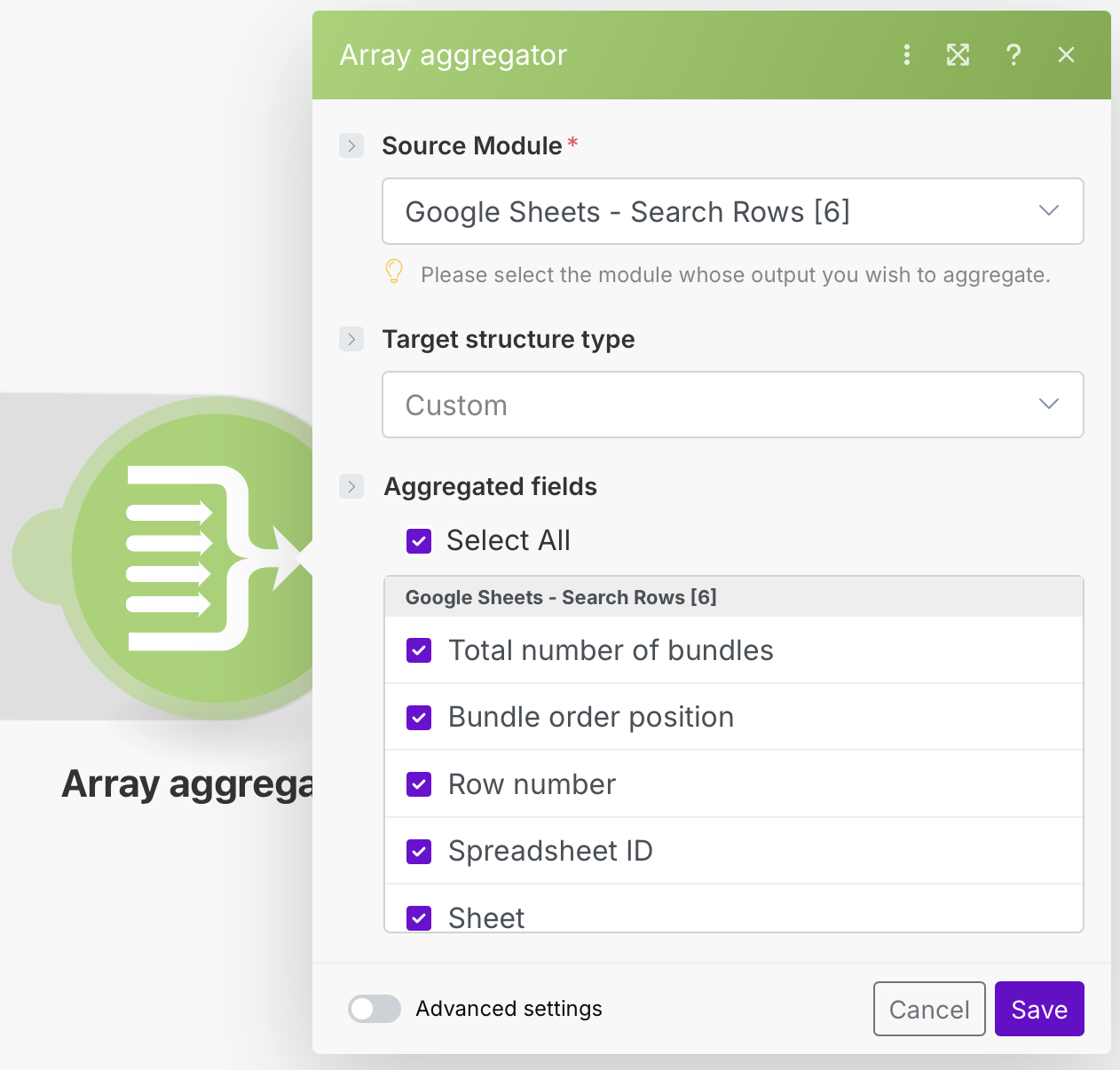 After that, we need an Array Aggregator that will allow us to process the previous modules before continuing with the automation. Here, we need to select the very first module "Google Sheets - Search Rows [2]" in the Source Module field to specify from where the data should be processed, and click on "Select All" in the Aggregated fields field.