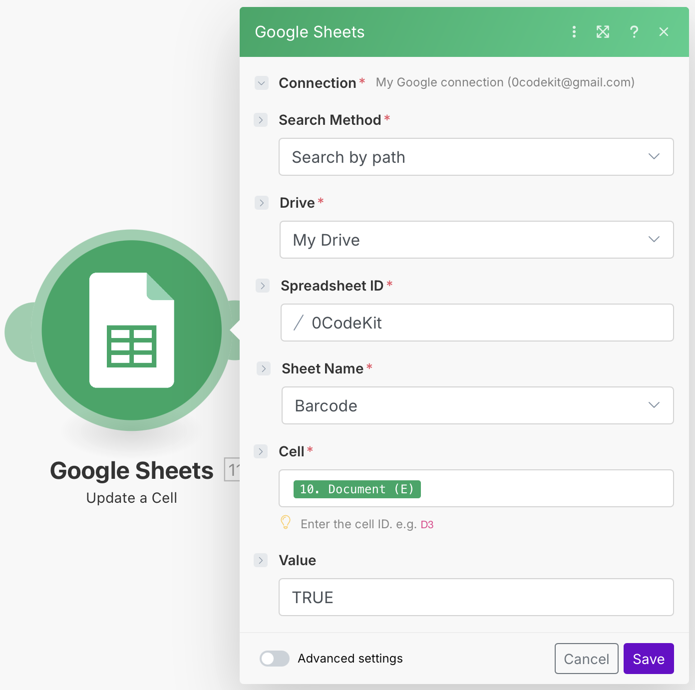 Finally, if the barcodes have been generated, we want them to be reflected in our Google Sheets. Therefore, we need to add another Google Sheets module with the event "Update a Cell". Here, we need to specify which cell from which spreadsheet and sheet we want to update, and we would like the value to be "TRUE" when the barcode has been generated.