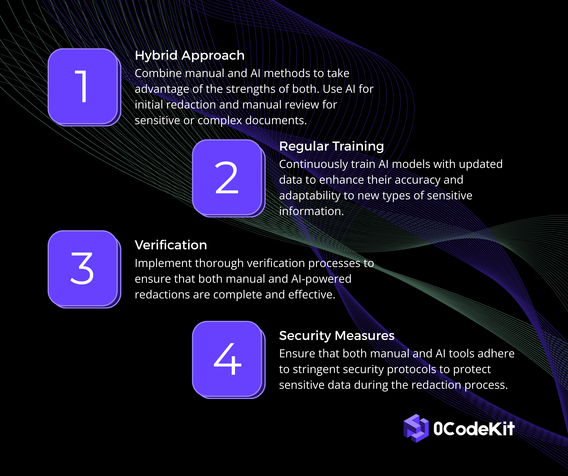 Sadly, AI also has its limitations. For example, the effectiveness of this method might depend on the quality of the data provided and how well they can understand it based on the training data. Subsequently, even though AI could reduce human errors, it can also make an error itself and miss sensitive information or redact non-sensitive data.