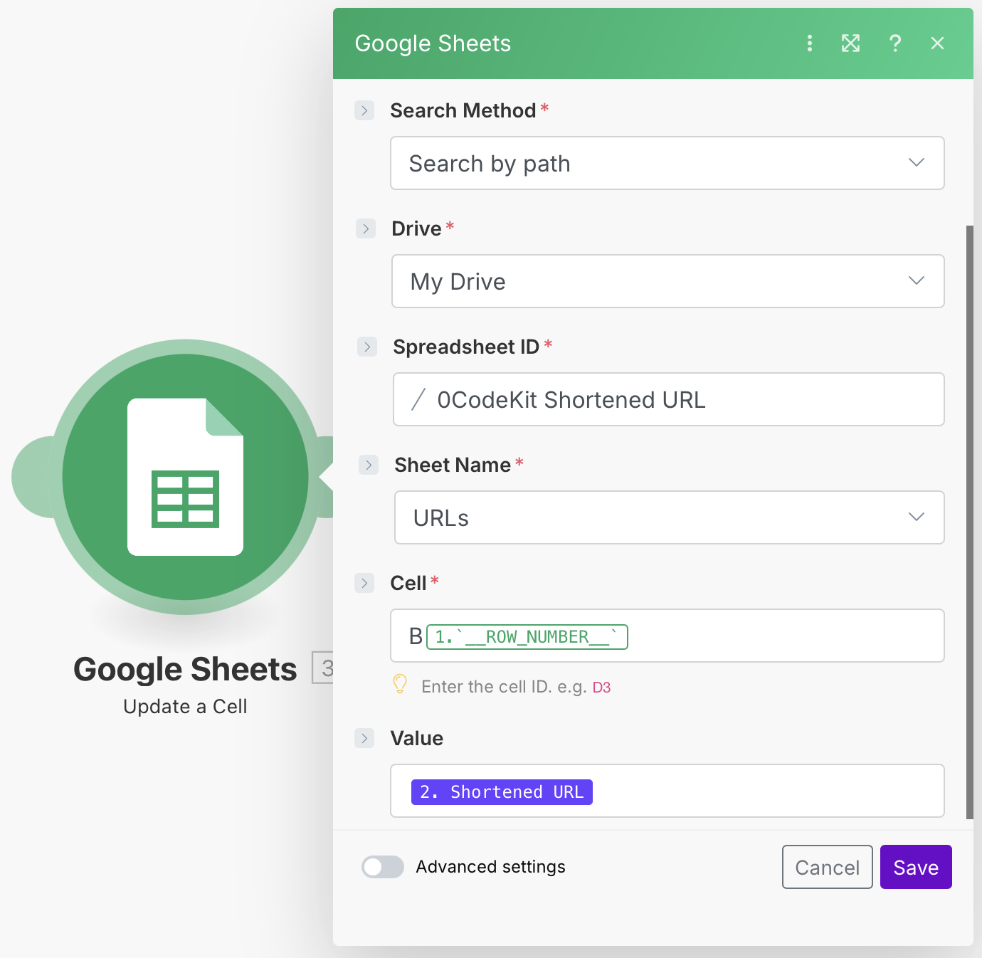 Finally, we have to integrate another Google Sheets module, but this time with the event "Update a Cell". This way, the shortened URL can be added to our Google Sheet. Again, we need to fill in some fields, such as:
