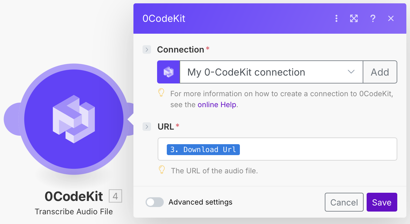 Next, we need to integrate one 0CodeKit module with the event "Transcribe Audio File" for the endpoint to download the audio file from the Dropbox URL. To set it up, we only need to enter the "Download URL" icon into the URL field.